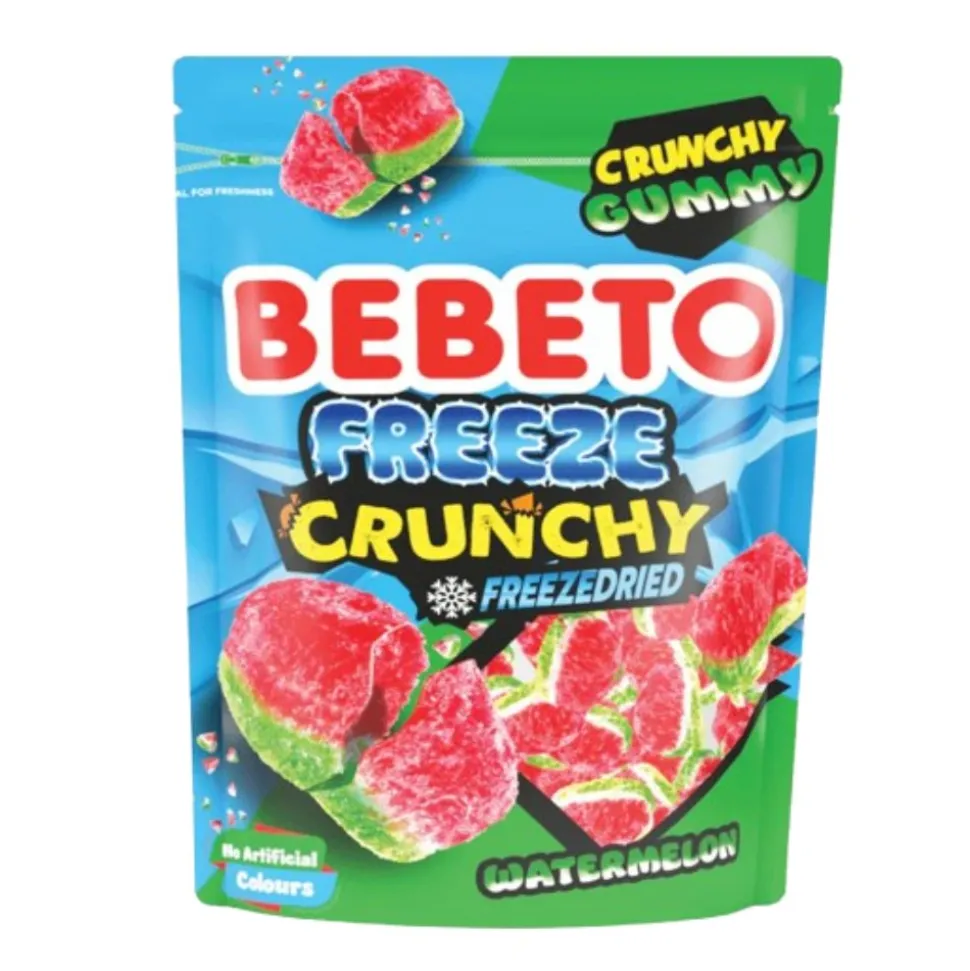 Confezione da 35g di Bebeto Freeze Crunchy Gummy Freezedried Watermelon, deliziose caramelle liofilizzate al gusto di anguria. Queste caramelle offrono un’esperienza unica: la loro croccantezza esterna si combina perfettamente con un intenso sapore fruttato che esplode ad ogni morso. Grazie alla liofilizzazione, il gusto fresco e dolce dell’anguria è mantenuto intatto, offrendo una pausa dolce irresistibile in qualsiasi momento della giornata.