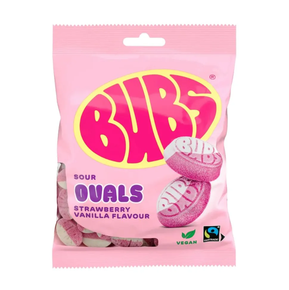 Confezione di Bubs Sour Ovals Strawberry Vanilla, caramelle gommose dal sapore aspro che unisce fragola e vaniglia. Queste caramelle ovali sono perfette per chi ama gusti fruttati dal tocco acidulo, con una consistenza morbida e piacevole da masticare. La combinazione di fragola fresca e vaniglia dolce e avvolgente rende ogni morso un’esperienza unica e golosa.
