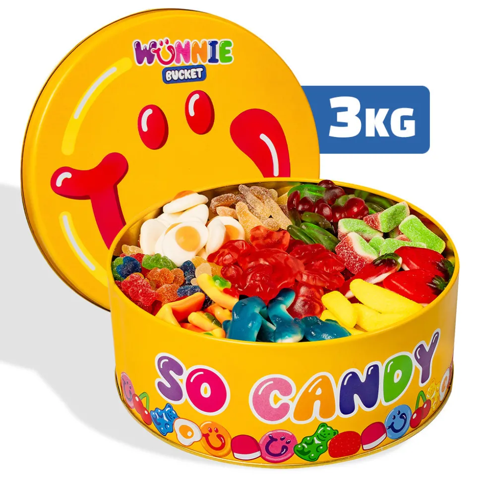Wunnie Bucket non è un regalo: è una scorta ufficiale di buonumore, un’invasione di felicità. Questa latta iconica piena fino all’orlo contiene 3 kg di caramelle gommose, un mix irresistibile di colori, profumi e sapori che mette d’accordo grandi e piccoli.