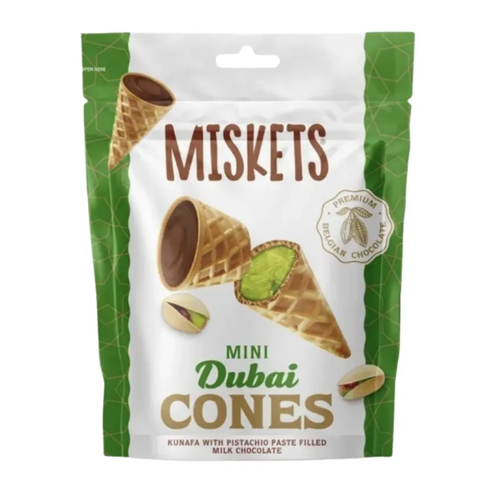 Confezione di Miskets Mini Dubai Cones, deliziosi coni di cialda ripieni di pistacchio e cioccolato al latte. Questi dolcetti uniscono la croccantezza della cialda alla dolce cremosità di un ripieno doppio, capace di soddisfare ogni voglia di qualcosa di buono e raffinato. Perfetti per una pausa golosa o per arricchire i tuoi momenti di relax con un sapore unico.